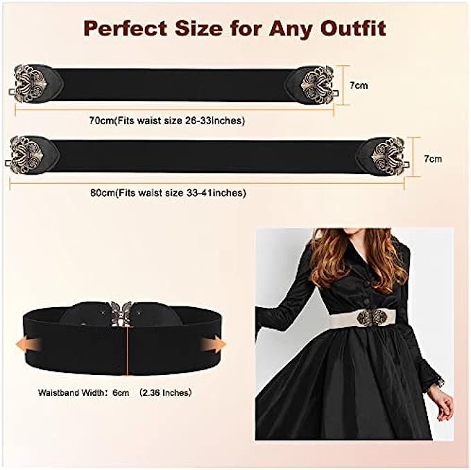 • ? Two Fit Size: The retro waist belt for dress has two size to choose. Size 70cm/27.5", perfect for waist size 26"-33"; Size 80cm/31.5", perfect for waist size 33"-41". And the waistband width is 6cm/2.36”. They are very stretchy, so they would work for a wide range of sizes.