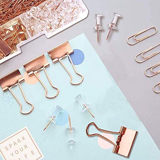 • 【Rose Gold Stylish】 This set includes rose gold push pins,paper clips and binder clips. The luxury rose gold color wichin is a new fashion will make your office sleek, modern, and confident.