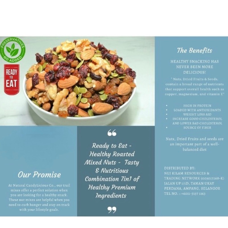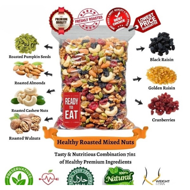 Quality:Not bad, seriously speaking. Occasion:Anytime feel like munching Taste:Not bad, quite a number of delicious raisins within. Hi Seller, Thanks so much for having this item sent fast enough to me. Am enjoying this with my friends, appreciates, cheers. The raisins are quite a lot, nuts and the rest has been way lesser. For me, it is alright. For nuts lover perhaps you can have the other selection(s).
