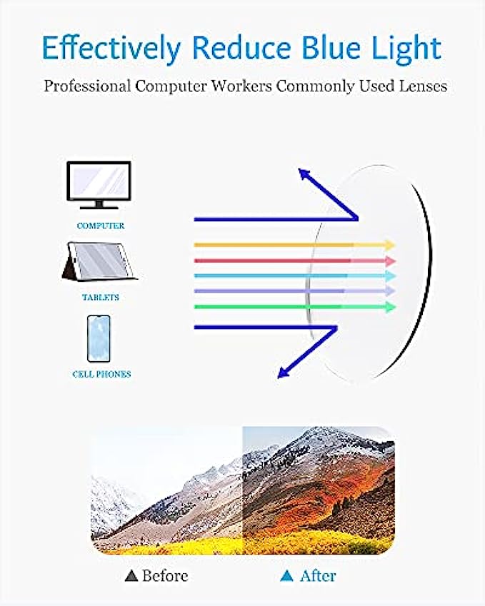 REDUCE DIGITAL EYE STRAIN - Enjoy your digital time, NO worry about eye fatigue, blurred vision and headache. ANTI BLUE LIGHT - Cut 90% of the blue light. Relieving eye fatigue, dry and vision falling. BETTER SLEEP - Reduce eye strain and headache, so you can enjoy a restful deeper sleep MATERIAL - Frame: TR90 ; Lens: Polycarbonate (Non-Prescription, no vision correction) LIFETIME WARRANTY--We provide worry free lifetime warranty and friendly customer service.