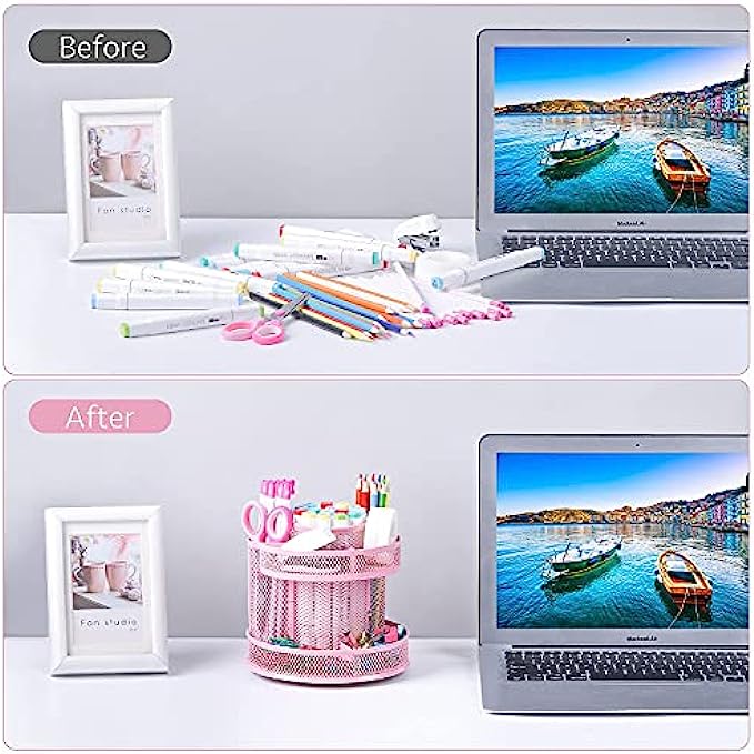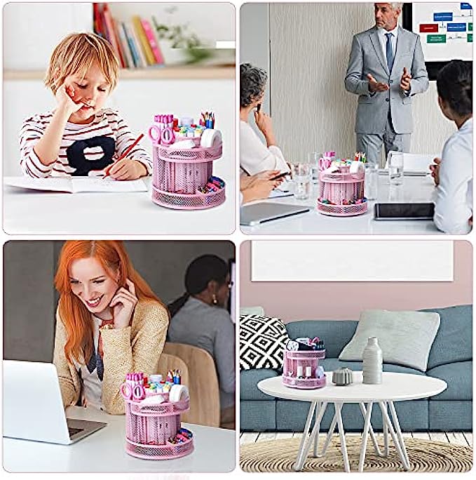 • 【360 DEGREE REVOLVING DESIGN】 This desktop organizer can be turned up to 360 degree rotation to the left and right .You can easily reach out to something useful and practical you need during working or studying.The product can be bilaterally and smoothly rotated, just turn as you please.