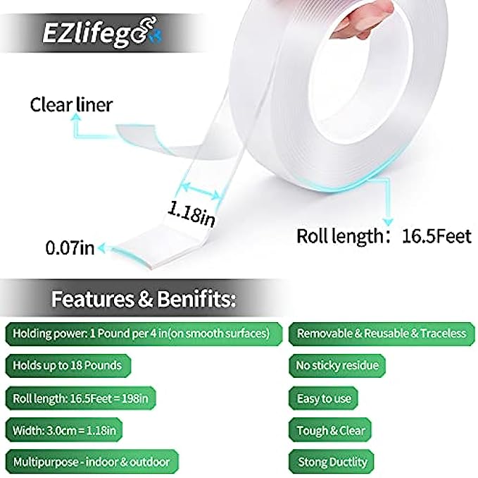 • 【EASY TO USE】- Size: length 16.5 Feet ,width 3.0cm(1.18in) ,thickness 0.07in.Strong Holding Power: Holds up to 18 pounds on smooth surfaces (1.2 pounds per 4 inches). It can be easily cut to any size or length you require.All you need to do is to stick the tape to the surface of the item.