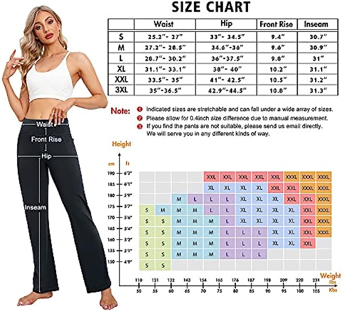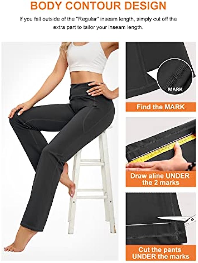 • UNIQUE DESIGN: Design your own work pants that suit you best, whether you’re tall or petite, slim or plus-size or anyother. You can alter these yoga pants to your preferred inseam length all on your own; find two symmetrical marks at the bottom of the flare pants and trim. Don't worry, they won't lose their bootcut shape in the process.