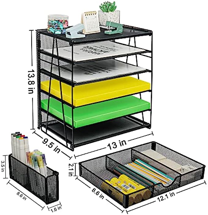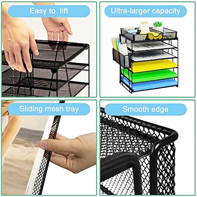 • 【Unique Mesh Desk Organizer】Desk file organizer you can organizer printed paper, letters, statements, folders, documents, magazines, desk accessories, desktop organizer with 5 Stackable trays and 1 sliding drawer + a pen holder divided in two. Desk organizer is the highest end of office organization design.