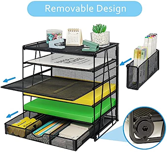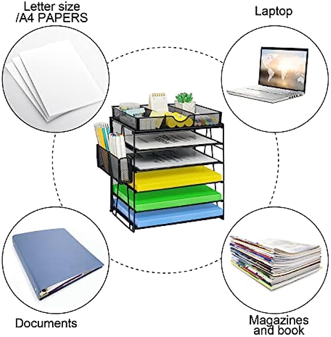 • 【Super Large Capacity】5 tier desk organizers and storage is ideal for your office, it has enough storage space for all your desk supplies can sort your files, paper, which is very convenient for you to find the files you need. This Letter tray design hanging pencil holder (with built-in hooks) has two to organize all your pens and pencils, and the sliding drawer can be placed at will and provides great space for your desktop.
