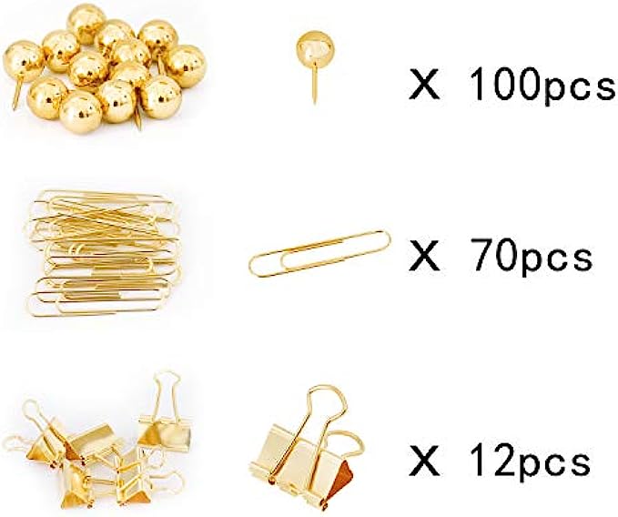 Gold Binder Paper Clips Set,182pcs Large Paper Clips,Binder Clips,Push pins, Office Supplies Clips for Women,Desk Accessory