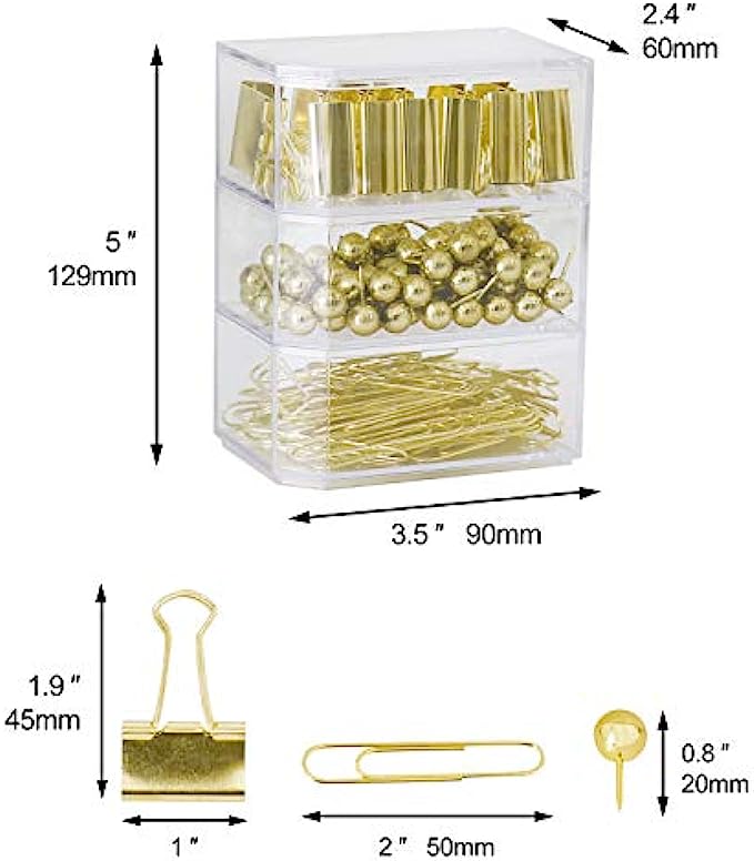 • 12pcs 25mm binder clips,70pcs 50mm paper clips,100pcs push pin(0.8inch).Packed in a reusable clear acrylic box to keep your desktop or your desk drawer organized