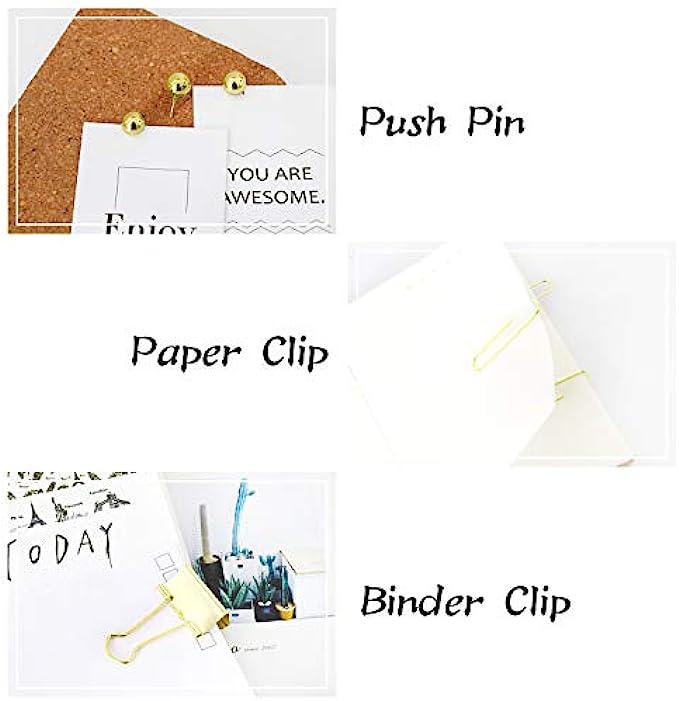 • Multi-Purpose: Fashionable metallic paper accessories set has a variety of items to suit your paper organizing needs. Binder Clips and Paper Clips are ideal for holding papers, notes, receipts, bookmark, files, tickets, other small items etc. Push Pins Use to pin important messages on any bulletin board, cork board, foam board, map and more. Map Tacks best for marking locations, Pin Clips leaving No Holes for photo or paper when holding.