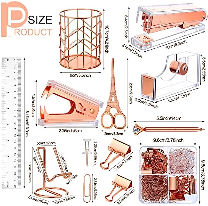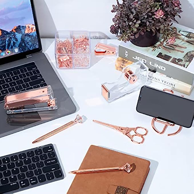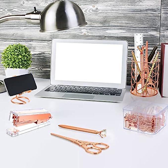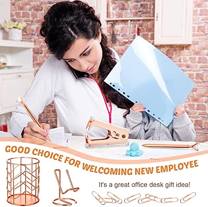 Office Stapler Set Desk Accessory Kit Including Stapler Tape Dispenser Staple Remover Pen Holder Phone Holder Ruler Scissors Binder Clips Staples 2 Pen for Office Accessories (Rose Gold)