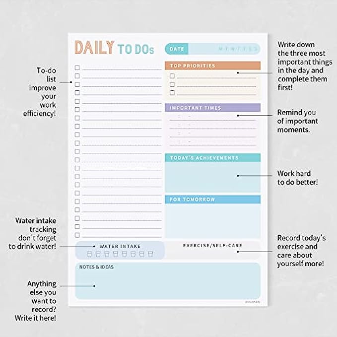 • Multifunctional To Do Notepad - After finishing today's daily work, you can also write down the things to do left for tomorrow. There is a section to remind you to drink eight glasses of water, and pay attention to your health during busy work. In addition, you can also record your exercise and ideas of the day.
