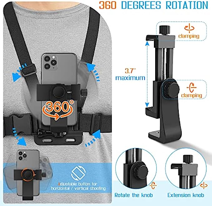 Phone Chest Strap Mount for POV/VLOG Videos, Chest Harness Holder Compatible with iPhone 13 12 11Pro Max Plus,Samsung,GoPro Hero 9, 8, 7, 6,AKASO,Action Camera and Cell Phone Video Shoot Accessories