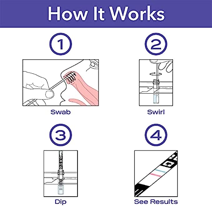 • How To Use: 1. Swab - Collect a gentle nasal swab sample. 2. Swirl - After adding the swab to the solution tube. 3. Dip - Put the strip into the tube. 4. Read Results - Straightforward and easy-to-read results