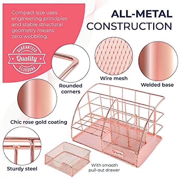 • ⭐ STYLISH ROSE GOLD DESIGN: A stunning combination of wire mesh and chic rose gold coating adds eye-catching vibrancy to any room. Modern style meets classic function in this cute desk organizer. Desktop organization just got an elegant new makeover