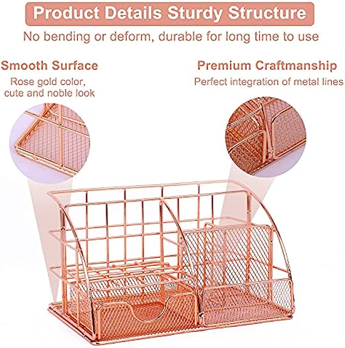 • FIT FOR YOUR DESK:Compact size and smart-looking make it fits your desk perfectly, allows you have enough space at your desk. Made of sturdy steel mesh with a solid base and beautiful rose gold finish, can be used for long time.