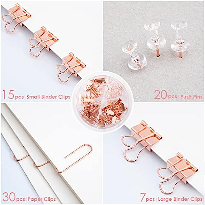 • FREE BONUS WITH OFFICE ACCESSORIES SET: Cute desk organizer with bonus 72 desk accessories (7 Large Binders + 15 Small Binders + 20 Pushpins + 30 Paper Clips), stored in a reusable clear acrylic box, making these clips easy to access and organize. These clips help keep your files organized.