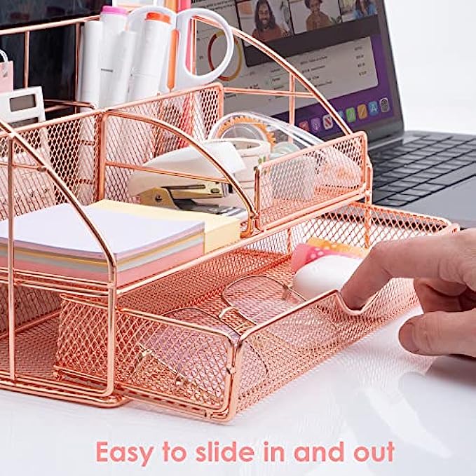 • UPGRADED DESIGN: After market research, we optimized the design of the pen holder. First, the pen holder is redesigned so that the pen doesn't slip out. Second, our desk organizer pull-out drawers slide in and out smoothly and easily when pulled out without jamming. Thirdly, after the rose gold increases the size, the A4 folder can be easily placed on the back. Finally, the desk organizer is fully assembled and just needs to be unboxed.