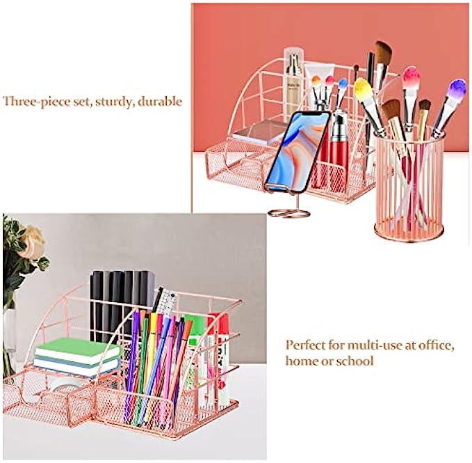 Verdefamily Rose Gold Office Supplies and Accessories, Desk Organizers Set of 3, with Pen Holder for Desk and Phone Holder, Rose Gold Desk Accessories for Women with 5 Compartment + Drawer