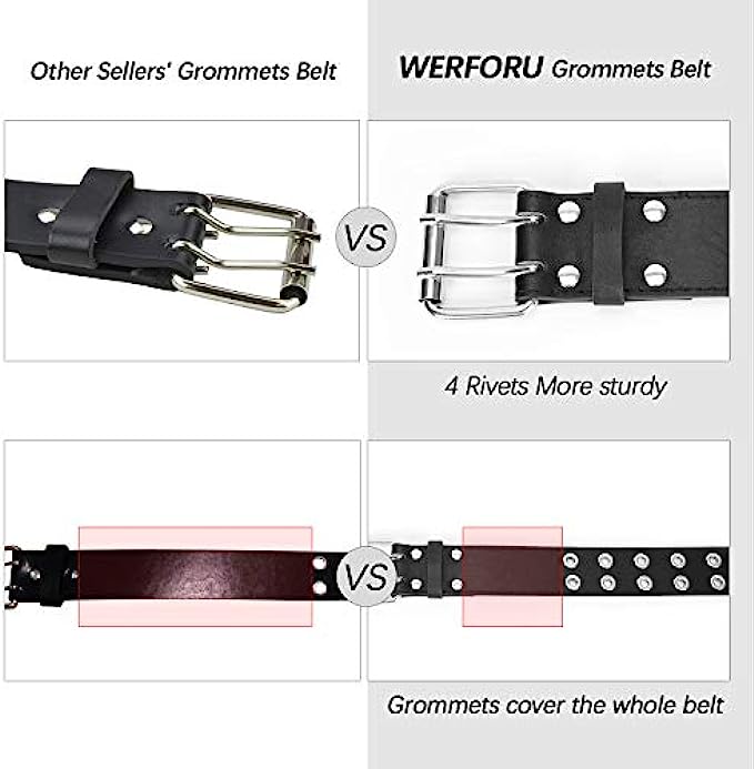 WERFORU Double Grommet Belt PU Leather Punk Belt for Women Men Jeans 2 Hole Belts 1.5 Wide