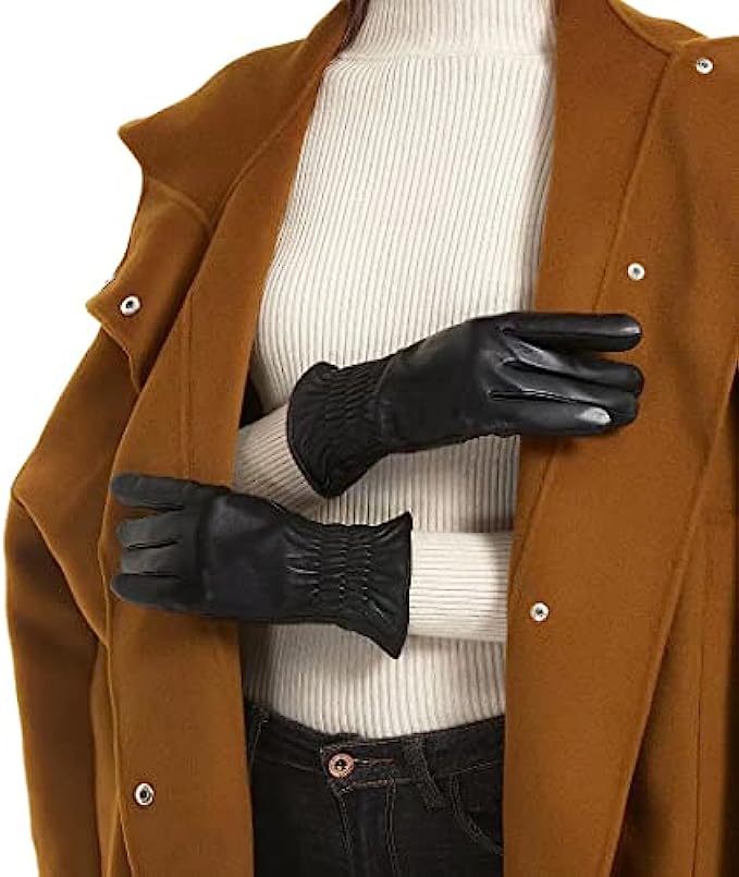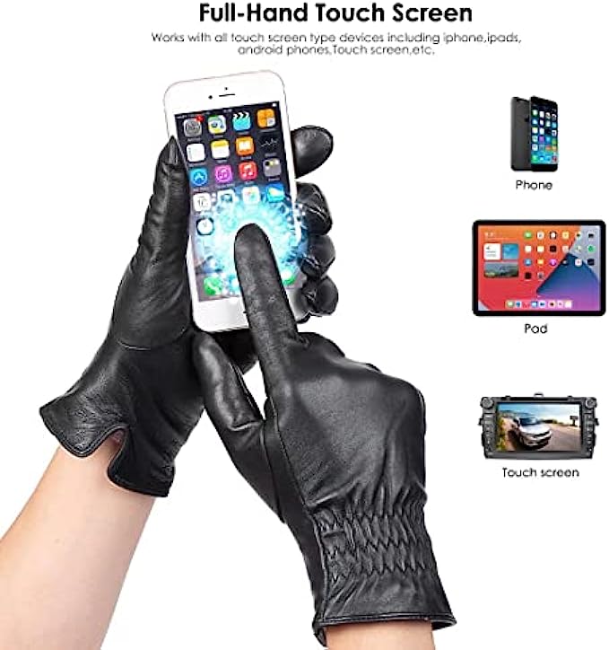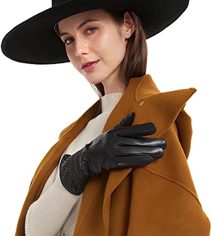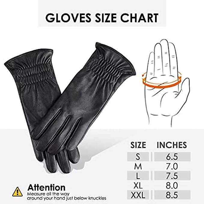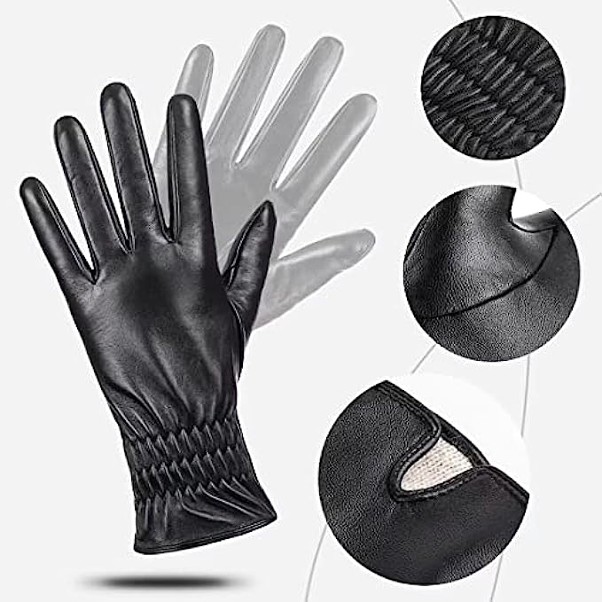 • 1.GENUINE LEATHER GLOVES: Outer are made of premium top layer genuine sheepskin leather with softness of touch, suppleness, strength and lasting comfort. Fully lined with Italian cashmere, let the gloves be your chic cold weather essentials.