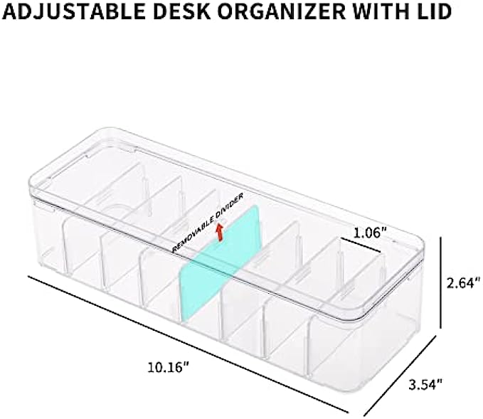• 【DIMENSION】: The overall dimension ( L x W x D): 10.1 x 3.5 x 2.6 Inches ( 25.8 x 9 x 6.7 cm); Compartment ( L x W x D): 3.3 x 1 x 2 Inches ( 8.6 x 2.7 x 5.3 cm). Package includes 2pcs of clear plastic storage boxes with lids and 20pcs of wire ties.