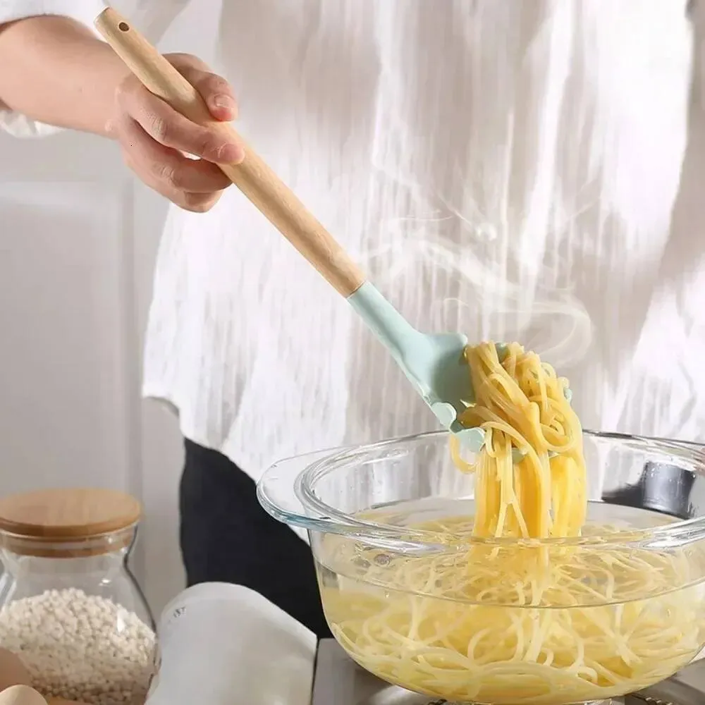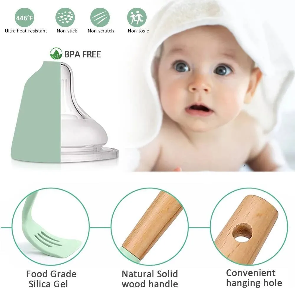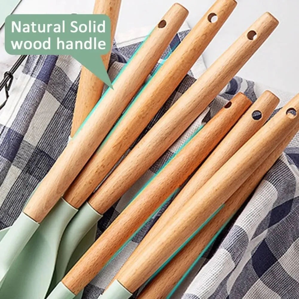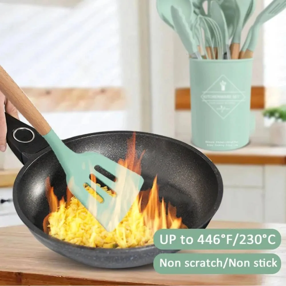 Complete 12-Piece Silicone Kitchenware Set: Includes essential children's utensils with odorless, food-grade silicone heads and sturdy wooden handles, designed to encourage safe and healthy cooking habits for kids ages 3 and up in everyday family kitchens.