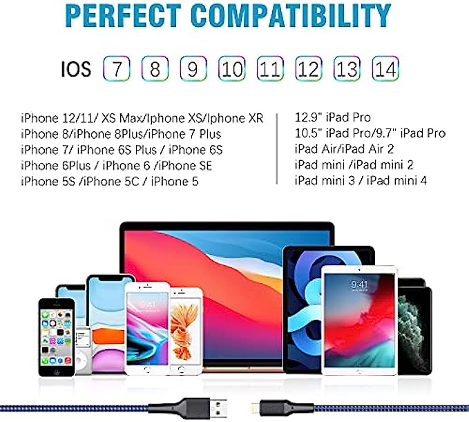 • Excellent Compatibility: iPhone charger cable can ensure compatibility with iPhone 12/12 Pro 11 / 11 Pro / 11 Pro Max / XS / XS Max / XR / X / 8 Plus / 8/7 Plus / 7 / 6sPlus / 6s / 6 Plus / 6 / 5s / 5c / 5, iPad Pro / iPad Air / Air 2 / iPad mini /mini 2 / mini 4 / iPad 4th generation, iPod Touch / iPod Nano 7th generation,etc. fully charged and Synchronous compatibility
