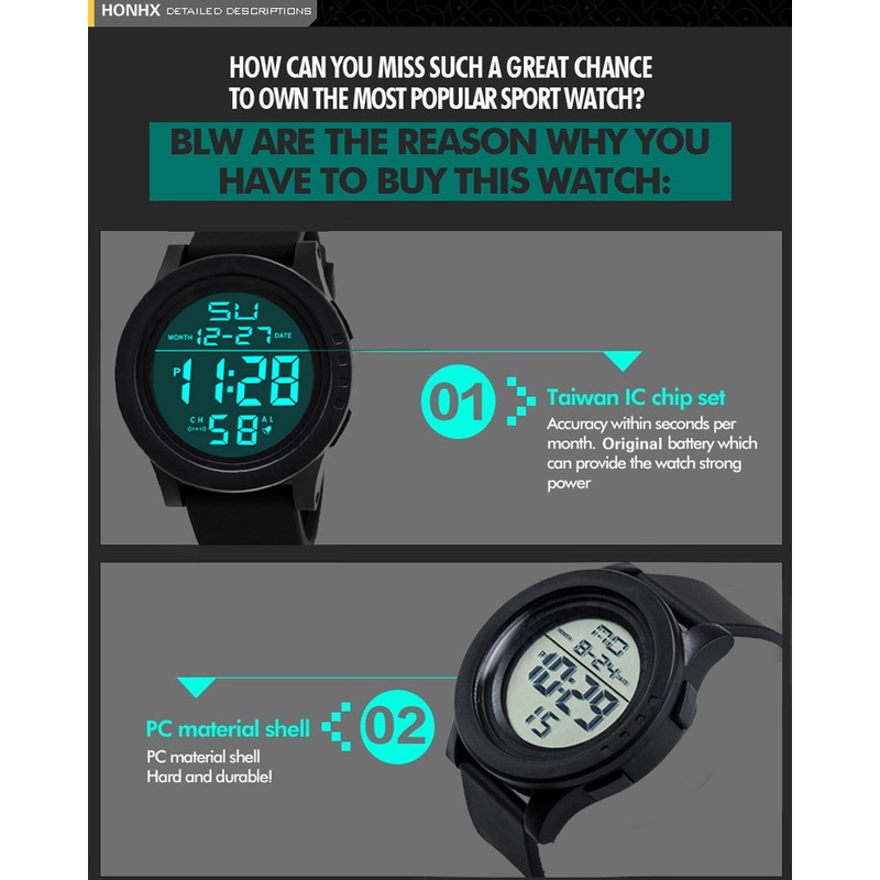Quality:For such a cheap price, this is a fantastic watch. All functions like regular time, alarm, stopwatch and timer are available and working perfectly??? The battery should last at least a half year for this digital display. Can buy from this trusted & reliable Seller. I love this watch with BIG BIG Digital Display. ?❤️????????