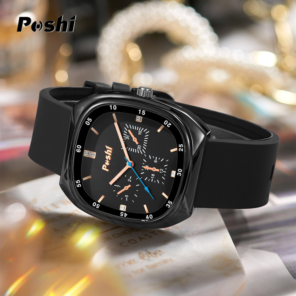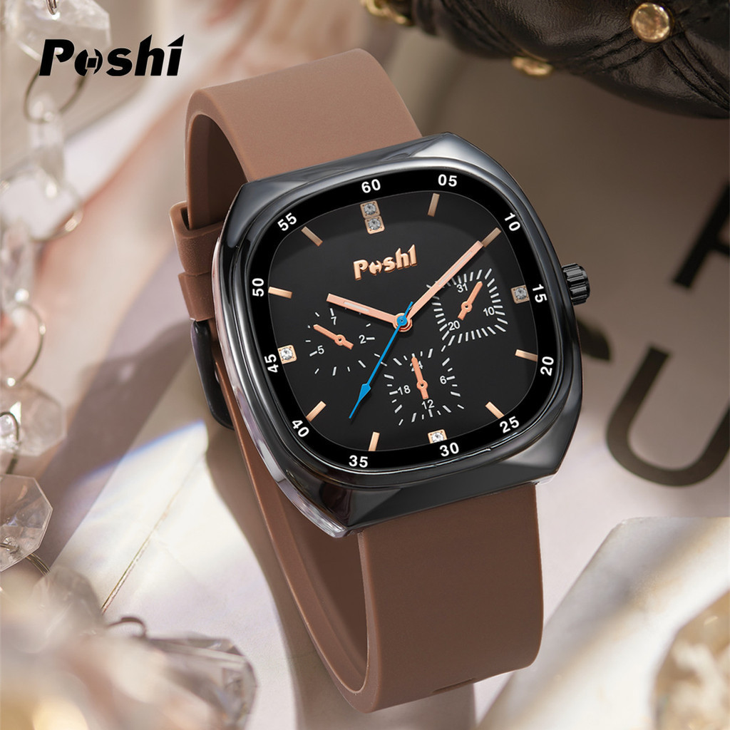 Poshi Waterproof Fashion Korean Quartz Women's Watch Square Dial Genuine Silicone Strap Elegant Watch