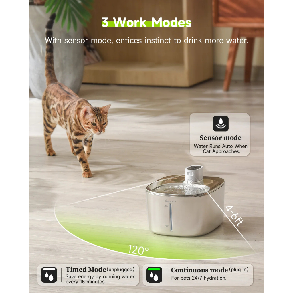 Wireless Cat Stainless Steel Water Fountain 4L Battery Operated with Water Level Window